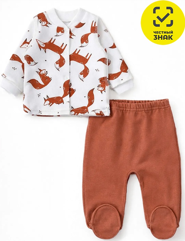 Комплект ясельный из мягкого футера с начесом, швы наружу. Кофточка на кнопочках и с открытыми ручками. Пояс ползунков на резинке, ножки закрытые.