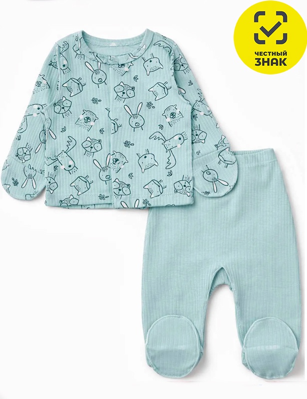 Ясельный комплект из ткани «лапша» состоит из распашонки и ползунков. Распашонка на кнопках с закрытыми рукавами, ползунки закрытые с резинкой на поясе.