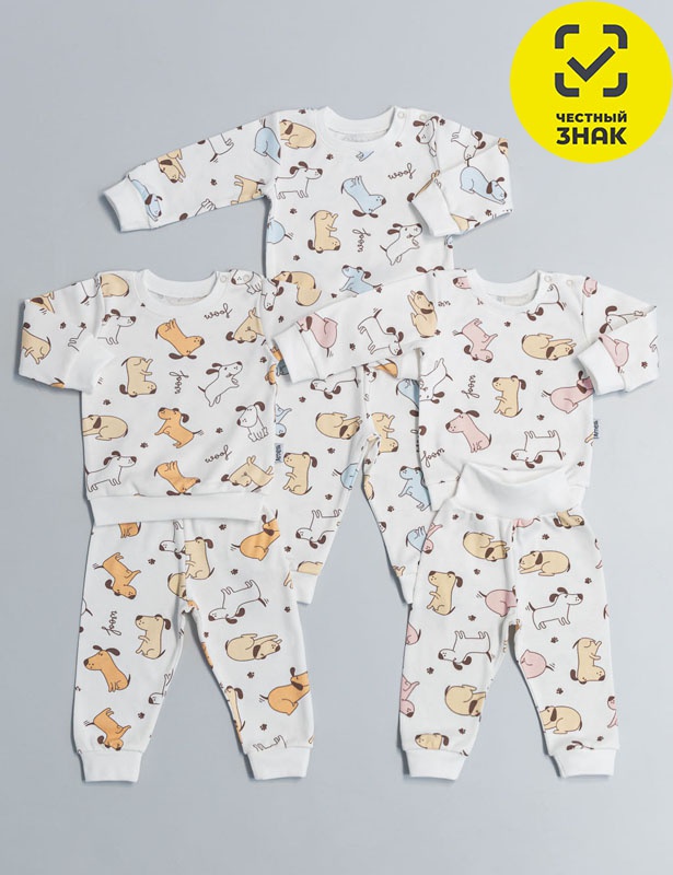 Комплект ясельный состоит из толстовки на двух кнопках в плече и брюк с широкой пришивной резинкой в пояснице и манжетами на ножках.