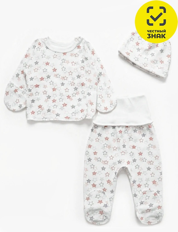 Комплект ясельный из интерлока состоит из 3-х предметов. Распашонка с длинным закрытым рукавом с царапками, ползунки с закрытой ножкой на эластичном поясе, шапочка.
