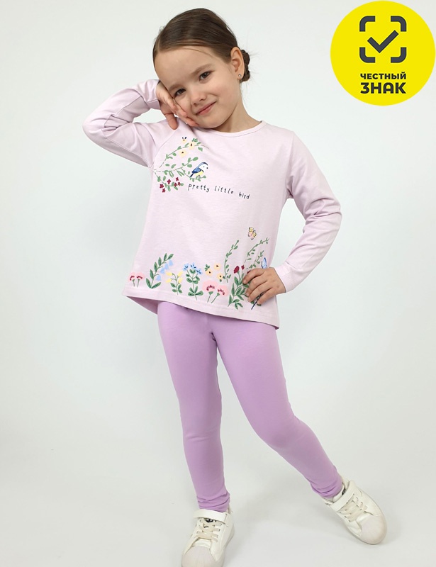 Комплект для девочки (джемпер+ лосины). Джемпер-силуэт трапеция, удлиненная спинка со сборкой из под кокетки. Рукав втачной, длинный. Перед с печатью. Горловина окантована, застежка по спинке на кнопки. Лосины-длинные, вверху на резинке.