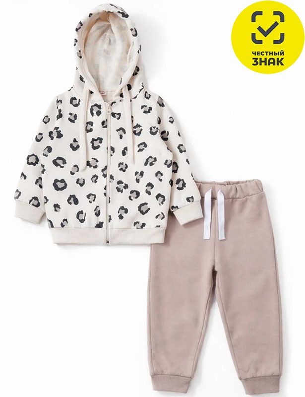 Костюм из футера двухнитки состоит их 2-х предметов. Джемпер с длинным рукавом с манжетом, капюшон, притачной пояс по низу изделия, застежка на молнию. Брюки прямые, на поясе на резинке.