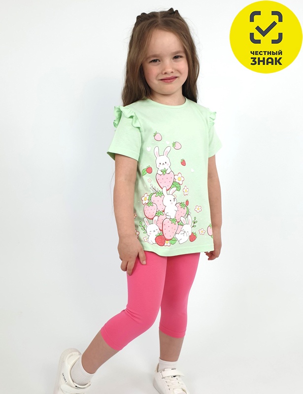 Комплект для девочки (джемпер+ лосины). Джемпер - силуэт трапеция, короткий втачной рукав, в пройме рюша. Горловина окантована, застежка на пуговицу по спинке. Печать на переде. Лосины-укороченные вверху на резинке.