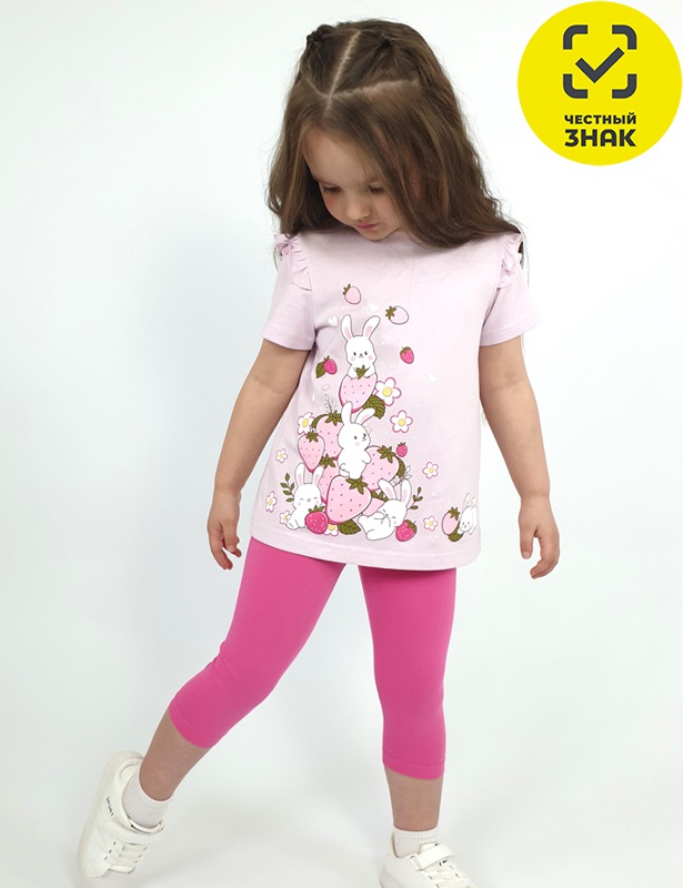 Комплект для девочки (джемпер+ лосины). Джемпер - силуэт трапеция, короткий втачной рукав, в пройме рюша. Горловина окантована, застежка на пуговицу по спинке. Печать на переде. Лосины-укороченные вверху на резинке.