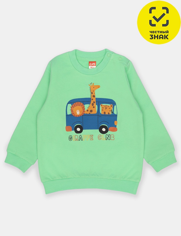 Джемпер для мальчика с длинным рукавом из мягкого футера с начесом. Горловина круглая, оформлена кашкорсе. На плече застежка на кнопки. На полочке выполнена шелкография в виде сафари автобуса с животными и надпись - клуб "жираф".