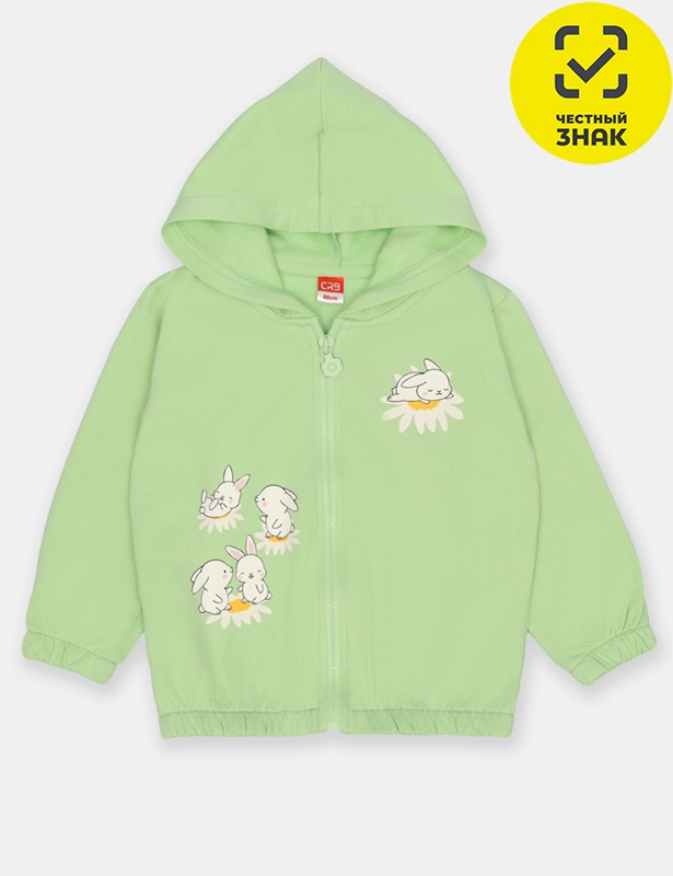Курточка для девочки с капюшоном из мягкого футера с начесом. Застежка на молнию. Пуллер на молнии в виде ромашки. Низ рукавов и низ изделиня на резинке. На полочках шелкография в виде забавных кроликов, сидящих на ромашках.