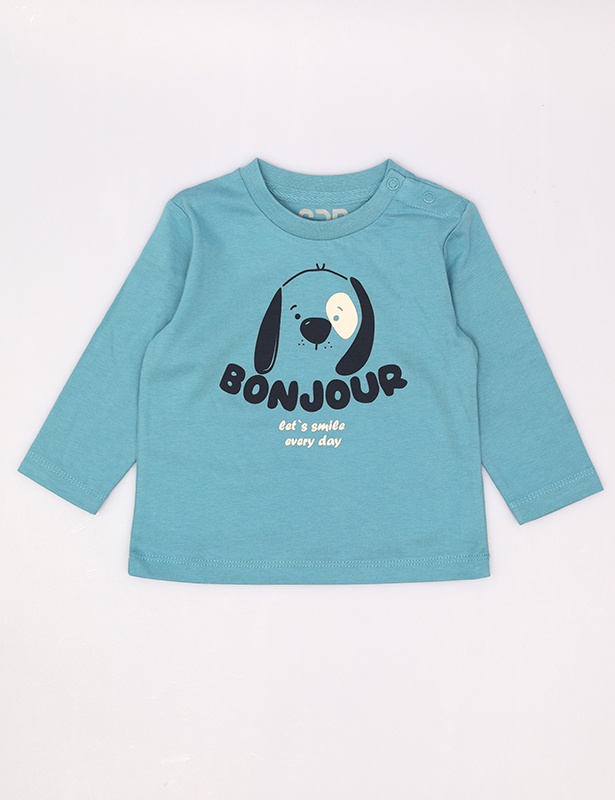 Джемпер для мальчика свободного кроя, изготовленный из мягкого трикотажа. Горловина круглая, оформлена рибаной, на плече расположена застёжка на кнопки. На передней части джемпера размещена шёлкография с изображением мордочки щенка. Надписи на двух языках: французская «привет» и английская «давай улыбаться каждый день».