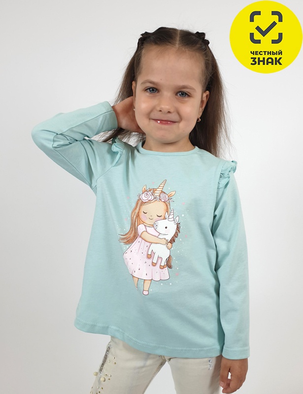 Джемпер для девочки, выполнен из кулирного хлопкового полотна, силуэт трапеция, длинный втачной рукав, в пройме рюша. Горловина окантована, застежка на пуговицу по спинке. Печать на переде.