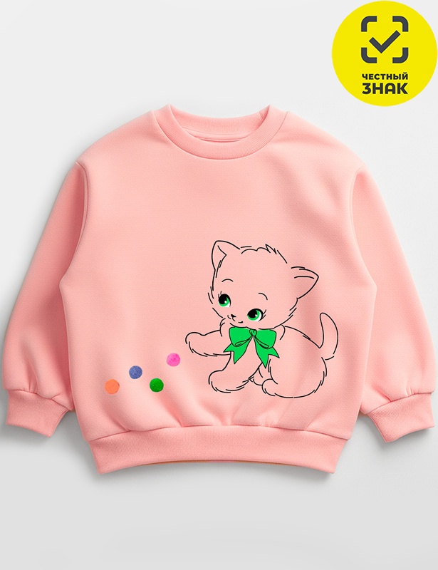 Толстовка для девочки свободного силуэта из футера двухнитки с начесом. Горловина округлая, длинные рукава с манжетами, по низу притачной пояс. На полочке выполнена печать.