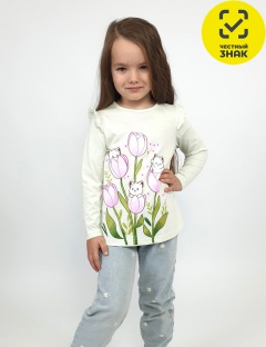 Джемпер для девочки - силуэт трапеция, длинный втачной рукав, в пройме рюша. Горловина окантована, застежка на пуговицу по спинке. Печать на переде.