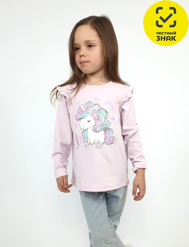 Джемпер для девочки - силуэт трапеция, длинный втачной рукав, в пройме рюша. Горловина окантована, застежка на пуговицу по спинке. Печать на переде.