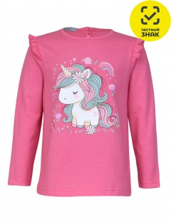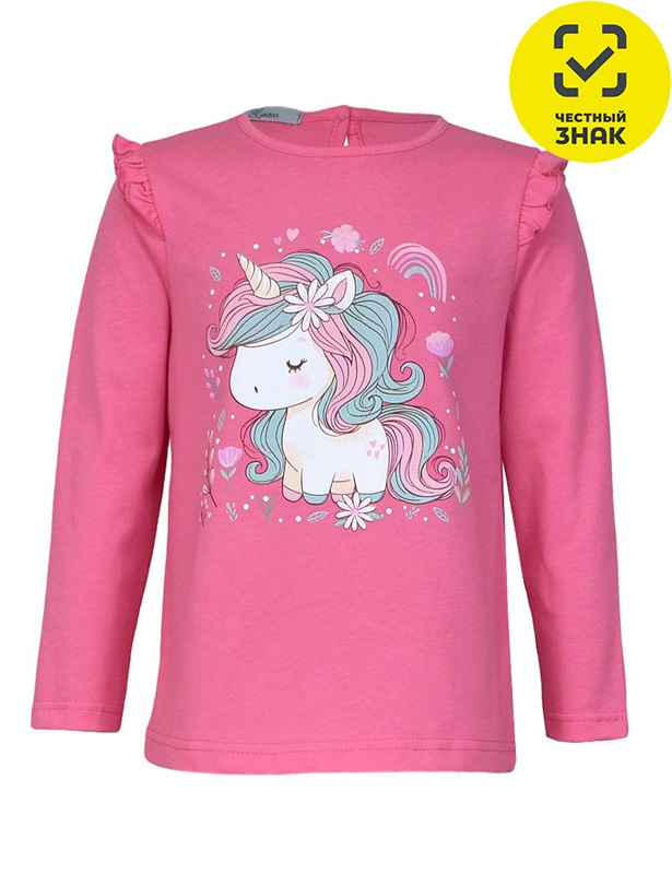 Джемпер для девочки - силуэт трапеция, длинный втачной рукав, в пройме рюша. Горловина окантована, застежка на пуговицу по спинке. Печать на переде.