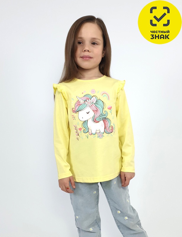 Джемпер для девочки - силуэт трапеция, длинный втачной рукав, в пройме рюша. Горловина окантована, застежка на пуговицу по спинке. Печать на переде.