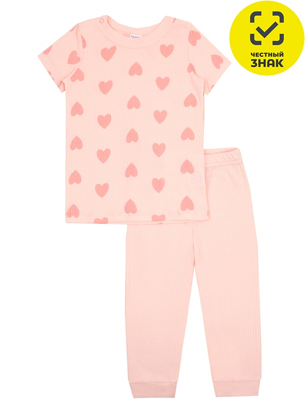 Пижамный комплект из нежного полотна «лапша». Футболка из набивного полотна с короткими втачными рукавами, округлой горловиной, застежкой на кнопки по плечу. Брюки полуоблегающего силуэта, по тали на резинке, зауженные к низу на манжет, выполнены из гладкокрашеного полотна.