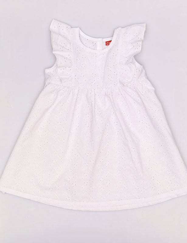 Платье для девочки из хлопкового шитья. Силуэт расклешенный. Горловина круглая. Плечо оформлено крылышком, переходящим на полочку и спинку. Застежка по спинке на пуговицы. Отрезная кокетка по переду и спинке. Юбочка на сборке.