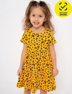 Платье для девочки из набивного полотна, короткие втачные рукава, округлый вырез горловины, окантованный бейкой из основного полотна, отрезное по линии талии, юбка со сборкой.