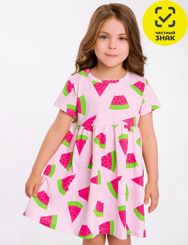Платье из набивного полотна, короткий рукав, юбка отрезная со сборкой. Горловина обработана планкой.