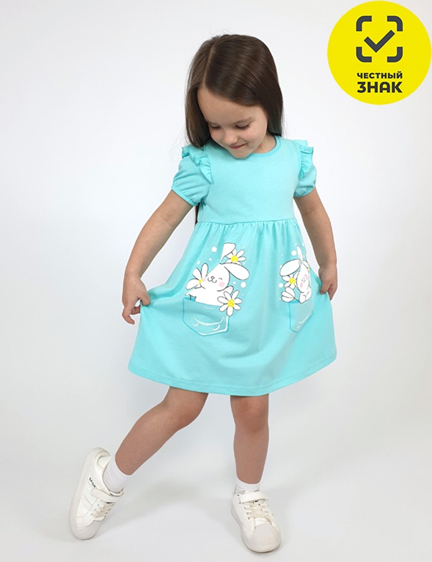 Платье для девочки, перед и спинка с кокеткой, сборка по верху юбки. Рукав короткий, внизу собран на резинку, в пройме рюша. Горловина обработана ластиком. Печать на переднем полотнище юбки.