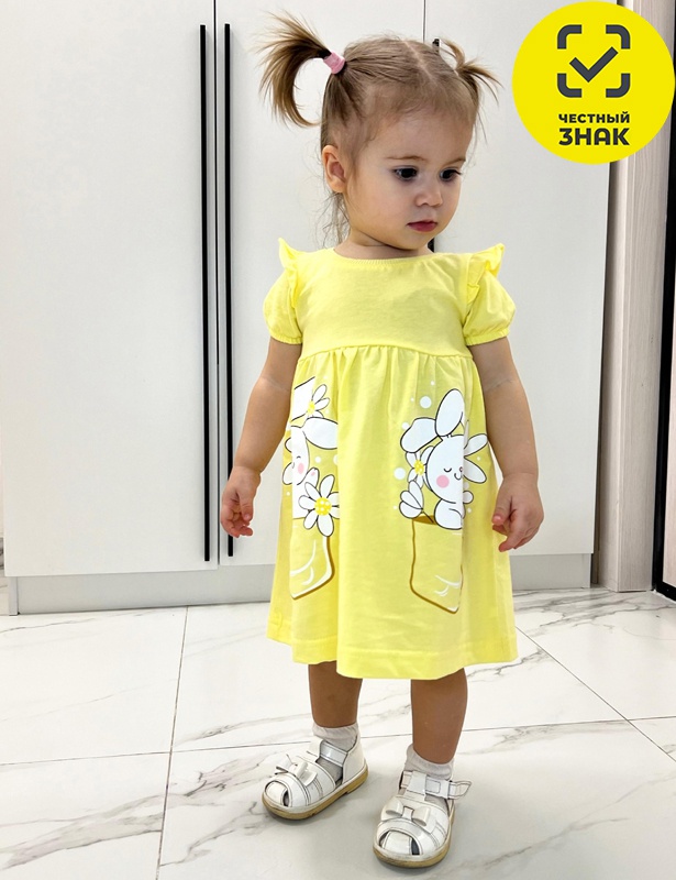 Платье для девочки, перед и спинка с кокеткой, сборка по верху юбки. Рукав короткий, внизу собран на резинку, в пройме рюша. Горловина обработана ластиком. Печать на переднем полотнище юбки.