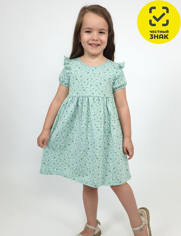 Платье для девочки - перед и спинка с кокеткой, сборка по верху юбки. Рукав короткий, внизу собран на резинку, в пройме рюша. Горловина обработана ластиком.