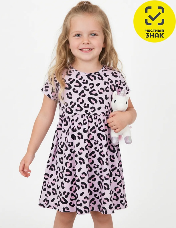 Платье для девочки из набивного полотна, короткие втачные рукава, округлый вырез горловины, окантованный бейкой из основного полотна, отрезное по линии талии, юбка со сборкой.