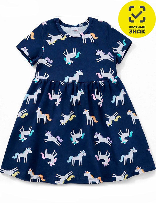 Платье для девочки из набивного полотна, короткие втачные рукава, округлый вырез горловины, окантованный бейкой из основного полотна, отрезное по линии талии, юбка со сборкой.