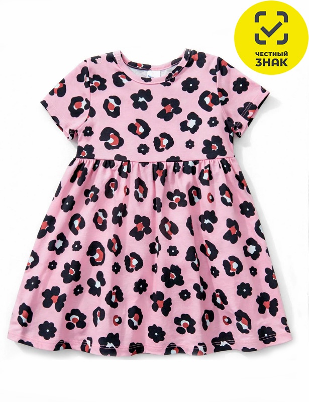 Платье для девочки из набивного полотна, короткие втачные рукава, округлый вырез горловины, окантованный бейкой из основного полотна, отрезное по линии талии, юбка со сборкой.