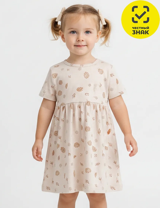 Платье для девочки из набивного полотна, короткие втачные рукава, округлый вырез горловины, окантованный бейкой из основного полотна, отрезное по линии талии, юбка со сборкой.