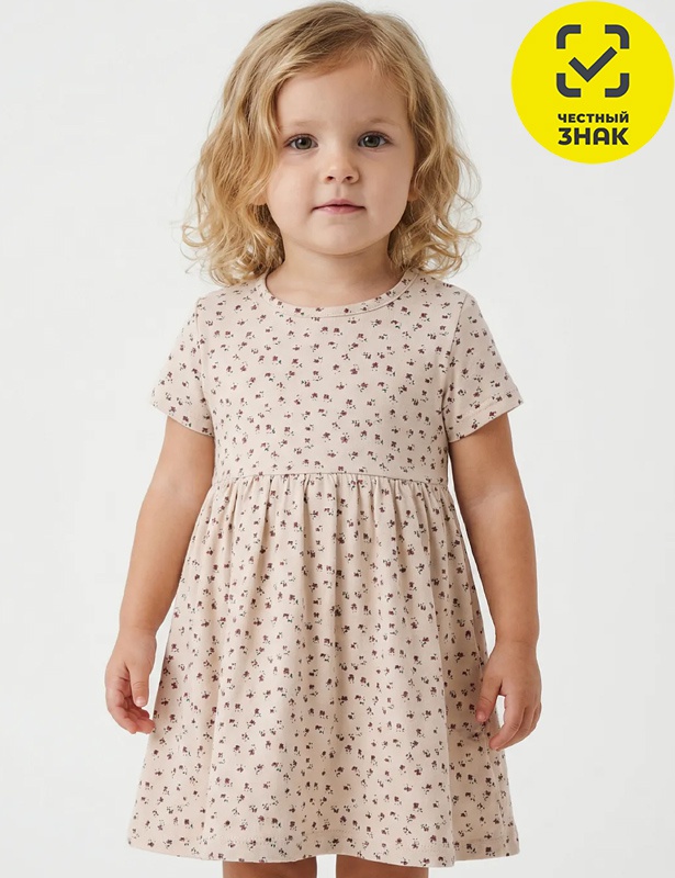 Платье для девочки из набивного полотна, короткие втачные рукава, округлый вырез горловины, окантованный бейкой из основного полотна, отрезное по линии талии, юбка со сборкой.