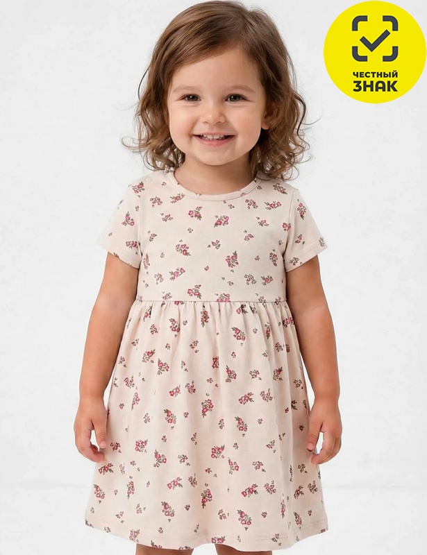 Платье для девочки из набивного полотна, короткие втачные рукава, округлый вырез горловины, окантованный бейкой из основного полотна, отрезное по линии талии, юбка со сборкой.