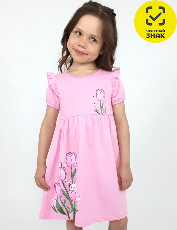 Платье для девочки - перед и спинка с кокеткой, сборка по верху юбки. Рукав короткий, внизу собран на резинку, в пройме рюша. Горловина обработана ластиком. Печать на кокетке переда и переднем полотнище юбки.