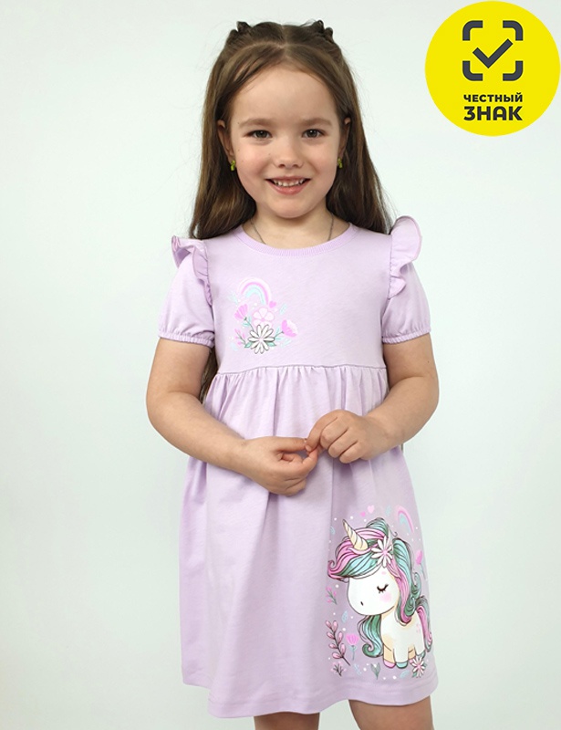 Платье для девочки - перед и спинка с кокеткой, сборка по верху юбки. Рукав короткий, внизу собран на резинку, в пройме рюша. Горловина обработана ластиком. Печать на кокетке переда и переднем полотнище юбки.
