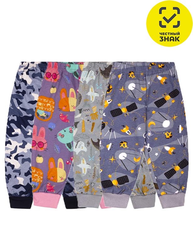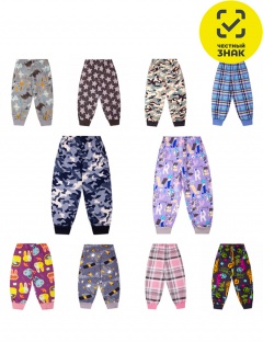 Брюки детские из набивного кулира. В поясе эластичная тесьма. Низ обработан рибаной с лайкрой.