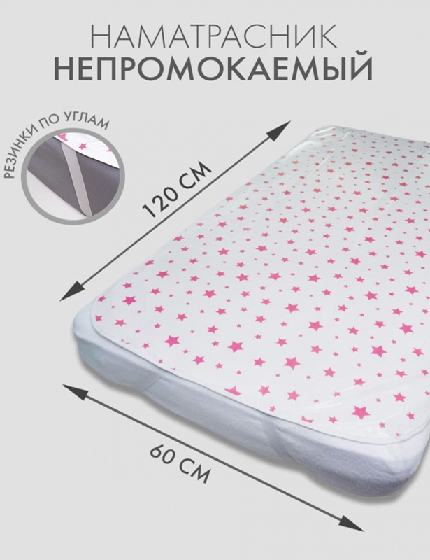 Наматрасник непромокаемый 60х120 см на резинках-держателях по углам. Производится из специального плотного материала с ПВХ покрытием. Верх - водонепроницаемое покрытие, низ - тканевая основа. Окантован по периметру. Обладает отличной теплопроводностью.