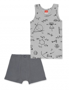 Комплект из набивной майки и гладкокрашеных трусов-боксеров. Горловина и проймы майки окантованы бейкой из гладкокрашеного полотна в цвет основы. Верхние и нижние срезы трусов-боксеров обработаны плоским швом вподгибку. По верху одновременно проложена резинка.