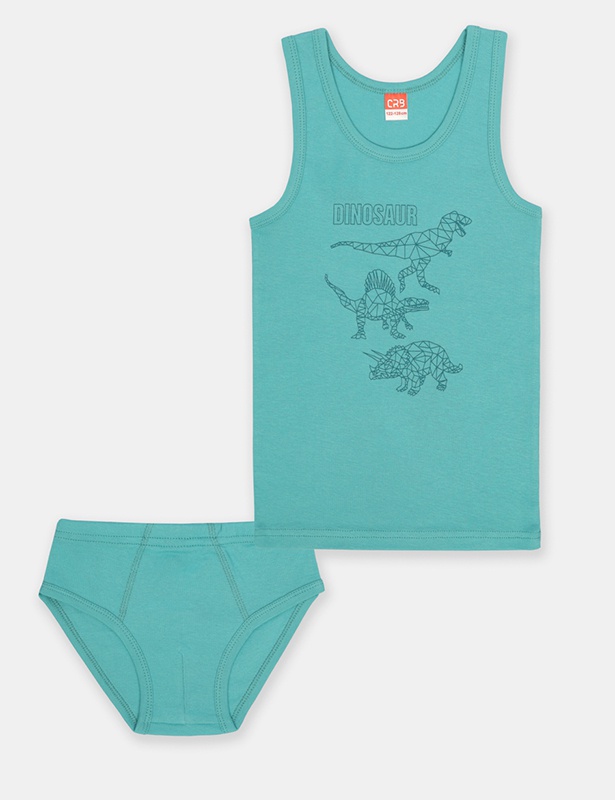 Комплект для мальчика, выполненный полностью в одном цвете из гладкокрашеной рибаны. Горловина и проймы майки окантованы бейкой из основного полотна. Перед оформлен шелкографией. Верх трусов обработан плоским швом в подгибку с одновременным прокладыванием резинки. Проймы ножек окантованы бейкой из основного полотна.