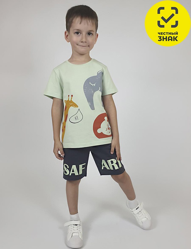 Комплект для мальчика. Футболка прямая, перед и спинка с печатью. Вышивка (аппликация) на переде. Рукав втачной, короткий. Горловина обработана ластиком. Шорты укороченные с притачным поясом и резинкой. Два боковых кармана по переду.
