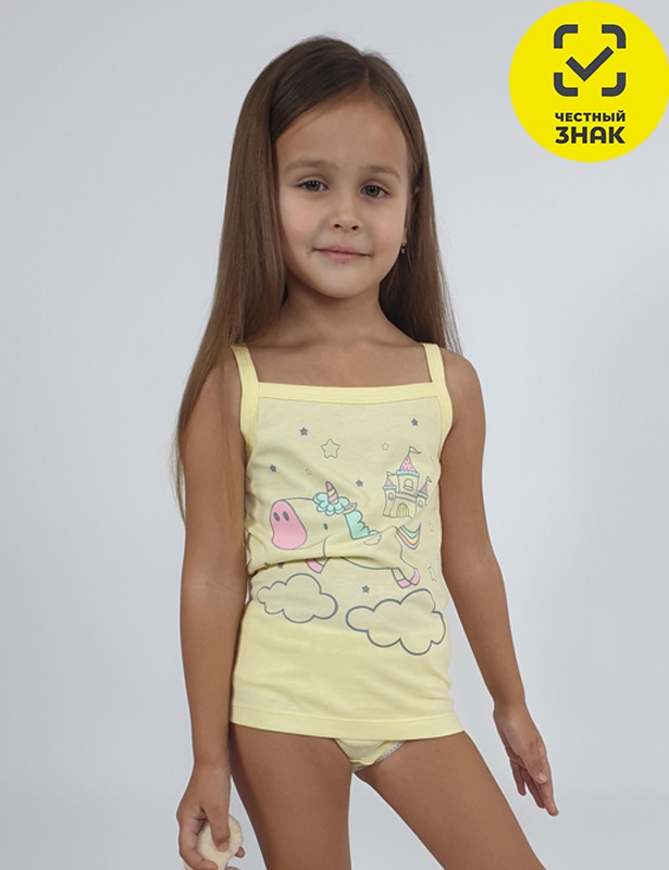 Набор для девочки (майка+трусы). Майка на бретелях, перед с печатью. Трусы на резинке, ножки обработаны ажурной резинкой.