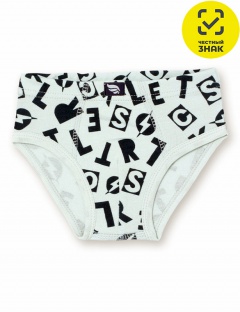 Трусы из набивного полотна. Верх трусов обработан плоским швом вподгибку с одновременным прокладыванием резинки. Проймы ножек обработаны окантовкой из гладкого полотна в цвет основы. Посередине верхнего края переда настрочена декоративная этикетка.