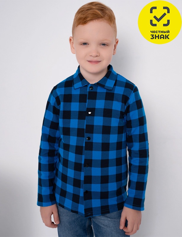 Рубашка для мальчика из футера двухнитки с начесом, с длинными втачными рукавами с манжетами и заплатками на локтях, отложной воротник, застежка центральная на кнопки.