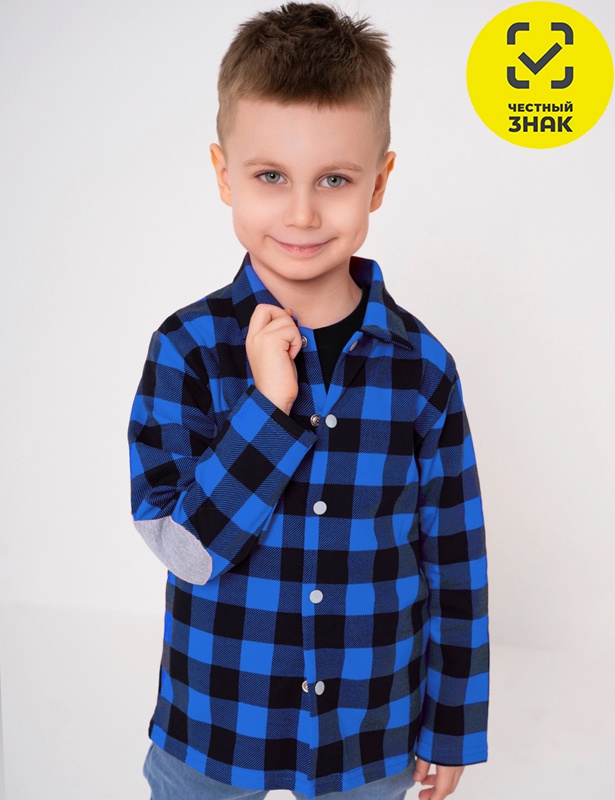 Рубашка для мальчика из футера двухнитки с начесом, с длинными втачными рукавами с манжетами и заплатками на локтях, отложной воротник, застежка центральная на кнопки.