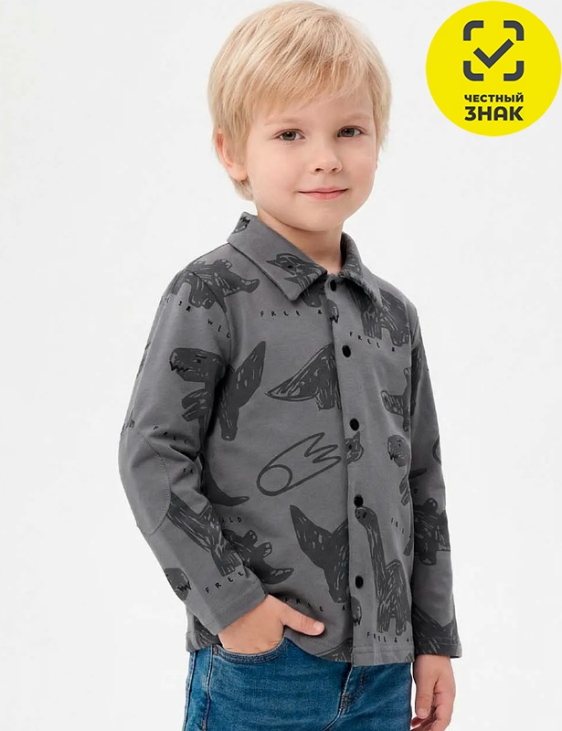 Рубашка для мальчика из футера двухнитки с начесом, с длинными втачными рукавами с манжетами и заплатками на локтях, отложной воротник, застежка центральная на кнопки.