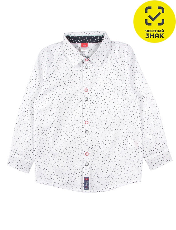 Рубашка с набивкой "треугольники", полуприталенного силуэта, с длинным рукавом рубашечного покроя, с притачными манжетами, с застегивающейся шлицей рукава из хлопка. Воротник обтачной с притачной стойкой. Спереди нашивка. Нашивка, стойка, манжет внутри и пуговицы контрастных цветов.
