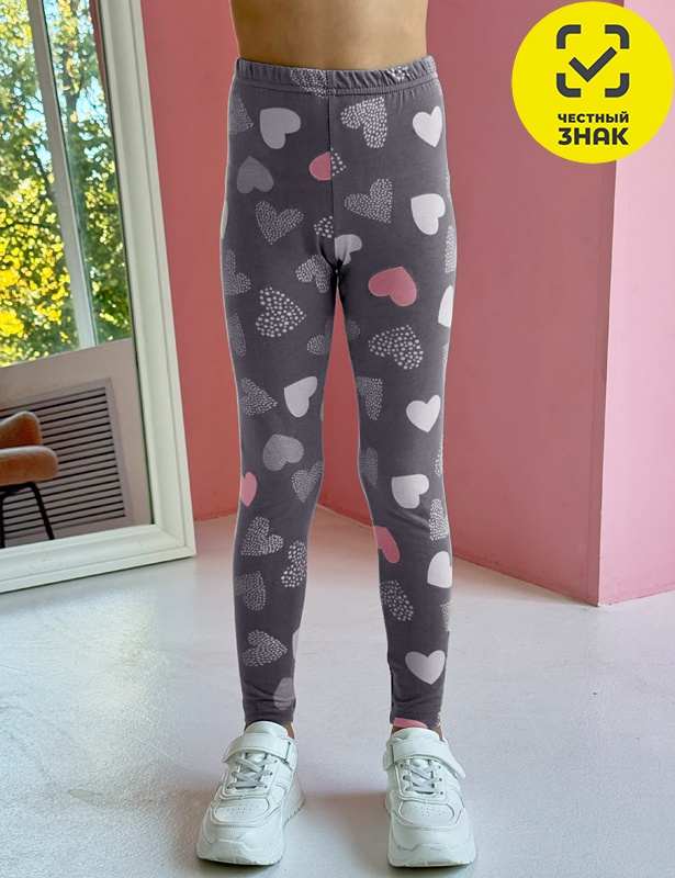Лосины для девочки: из мягкого трикотажа из полотна в набивку "сердечки", без боковых швов, длинной по щиколотку.