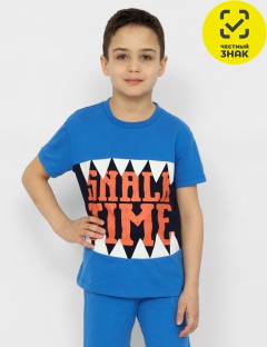 Футболка для мальчика из кулирной глади. Горловина обработана притачной бейкой из рибаны с эластаном. Перед разрезной, центральная часть переда контрастного цвета с принтом "Время перекуса". Рукав декорирован вязаной нашивкой.