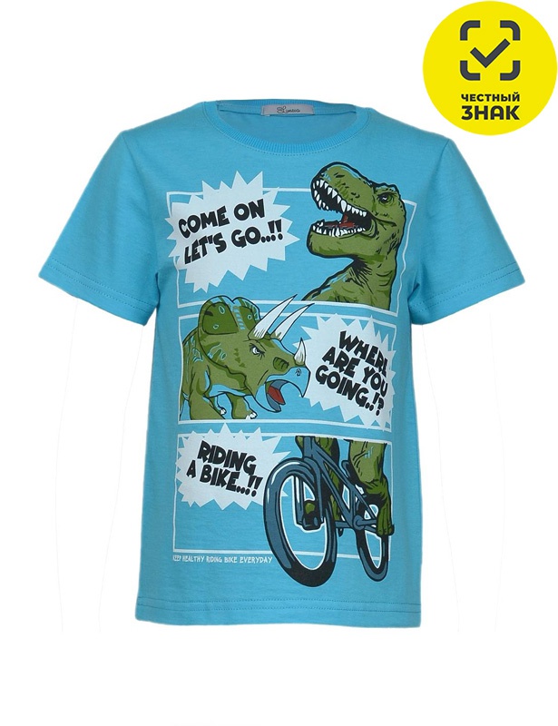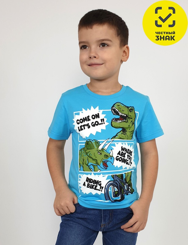 Футболка для мальчика прямого силуэта, перед с печатью, рукав втачной короткий. Горловина обработана ластиком. Низ изделия и рукава подшиты.