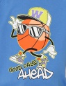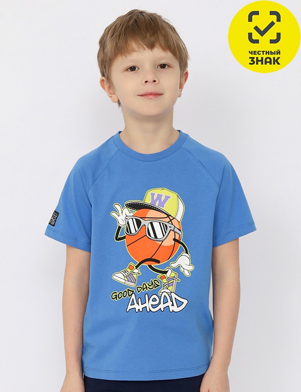 Футболка оверсайз для мальчика из кулирной глади. Рукав-реглан, горловина обработана притачной бейкой из рибаны с лайкрой. Перед декорирован принтом "Впереди хорошие дни?". Рукав декорирован вязаной нашивкой.