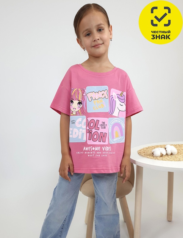Футболка (оверсайз) для девочки, спущенное плечо, короткий рукав. Печать на переде, горловина окантована планкой.