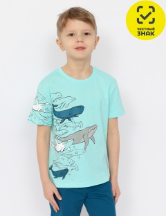Футболка для мальчика свободного покроя. Рукав втачной, горловина обработана притачной бейкой из рибаны с лайкрой. Перед и рукав декорированы принтом "Панно".