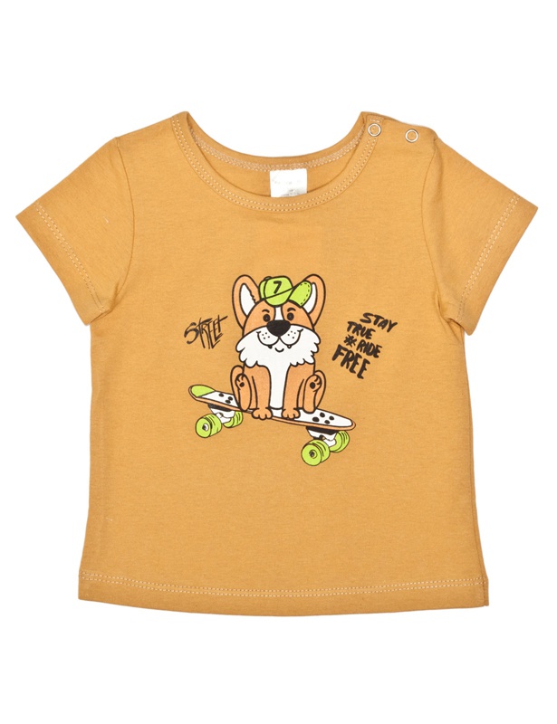 Футболка детская из гладкокрашеного кулирного полотна, короткие втачные рукава, округлая горловина. Размеры 80-92 с застежкой на кнопки по плечу. На полочке печать.